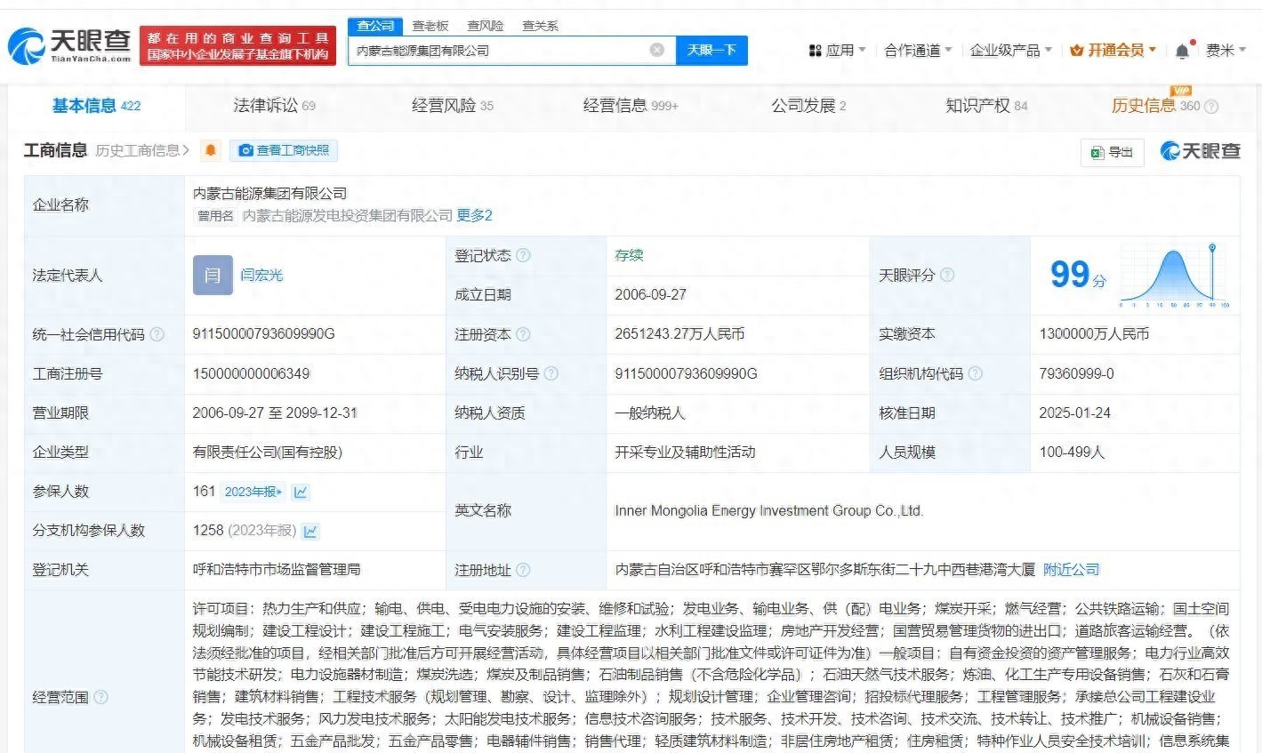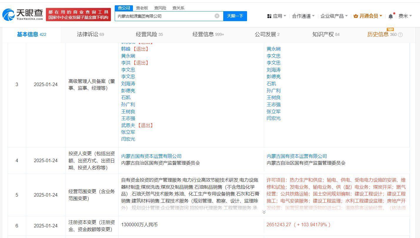 天眼查App显示,近日,内蒙古能源集团有限公司发生工商变更,注册资本由130亿人民币增至约265.1亿人民币,增幅约104%,同时多位高管发生变更。